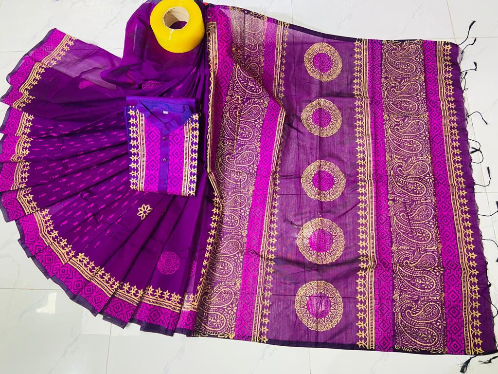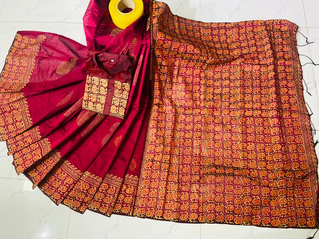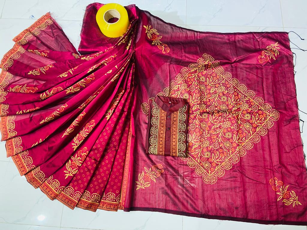 ধুপিয়ানসিল্ক শাড়ী ও ধুপিয়ান সিল্ক পানজাবি তে ব্লক প্রিন্ট কাজ করা।