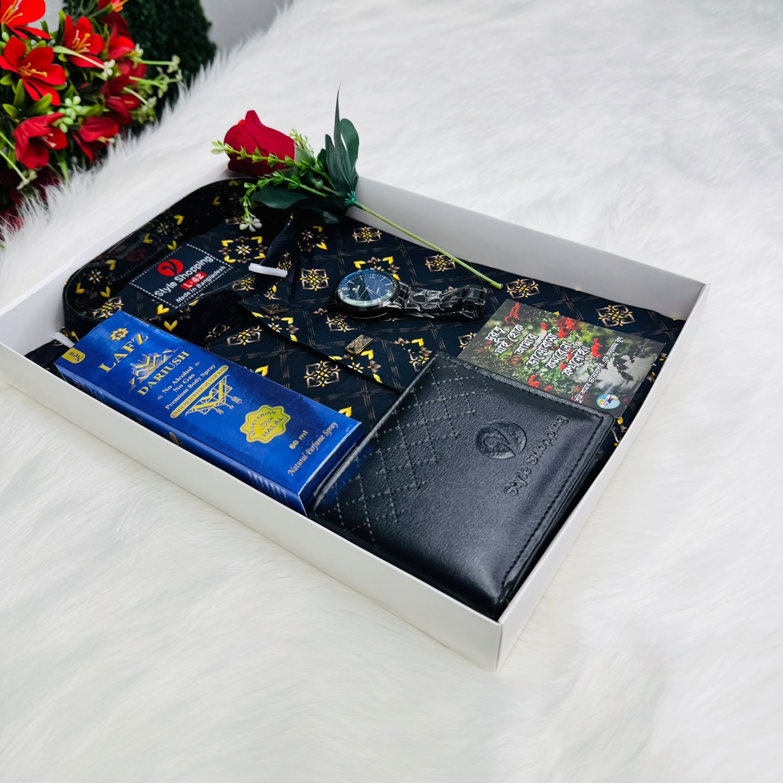পান্জাবি ,ঘড়ি ,মানিব্যাগ ,পারফিউম ,ফুল- গিফট কার্ড গিফট ব্ক্স